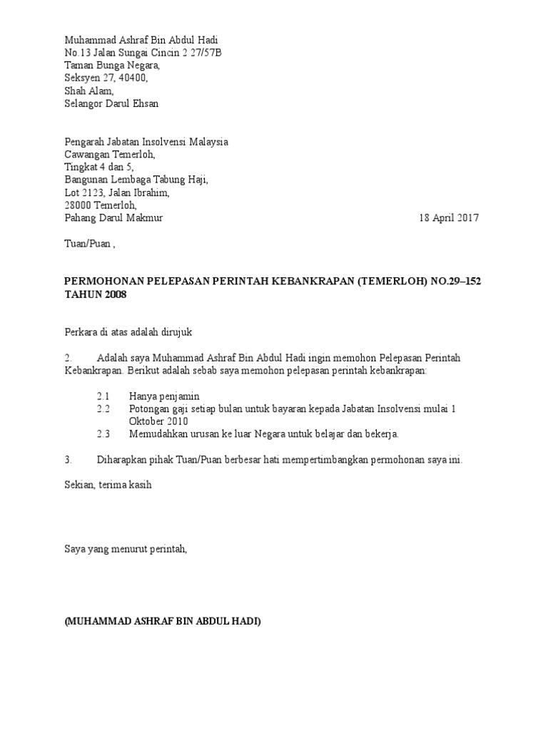 Contoh Surat Rayuan Pelepasan Bankrap Pewarna T