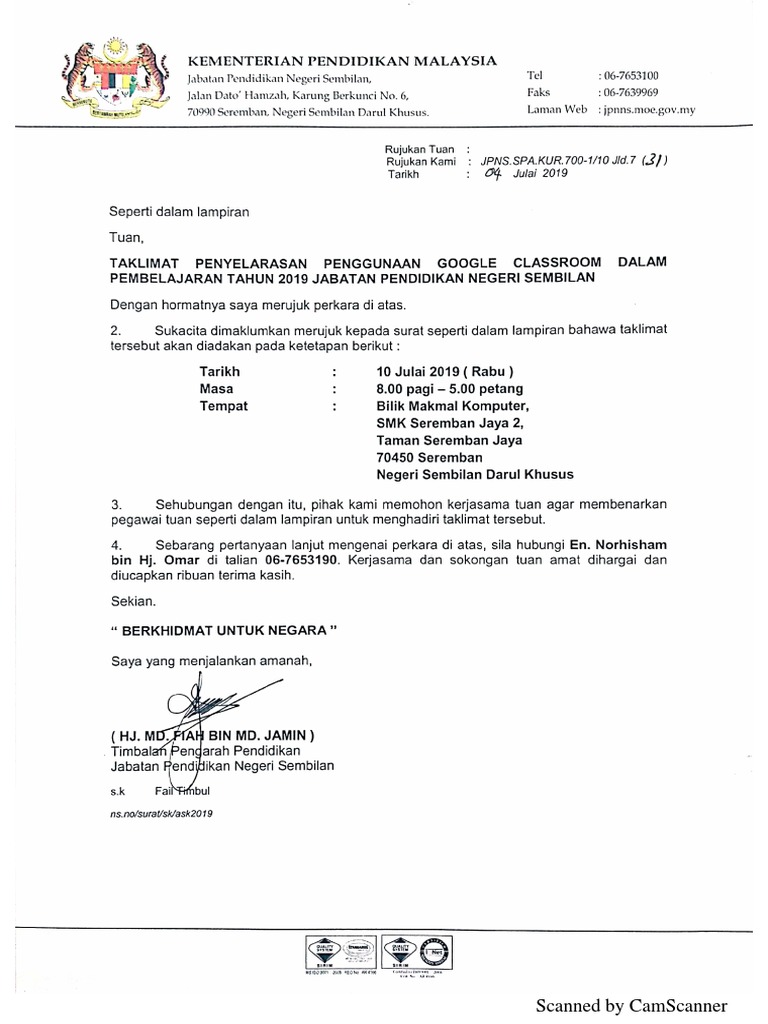 Surat Taklimat Penyelarasan Penggunaan Google Classroom 2019 Dalam