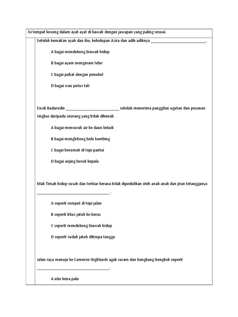 Latihan Peribahasa Dan Simpulan Bahasa Latihan 16 Soalan