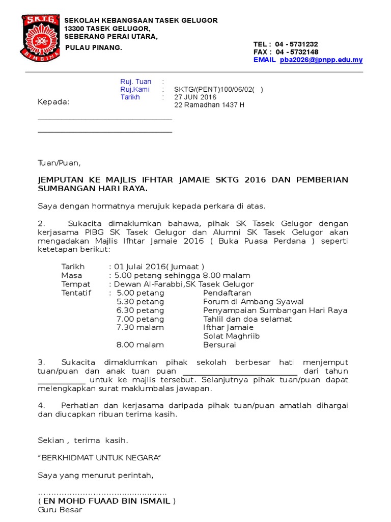 Surat Jemputan Majlis Berbuka Puasa Anjuran Pibg Sk St Mary Kl