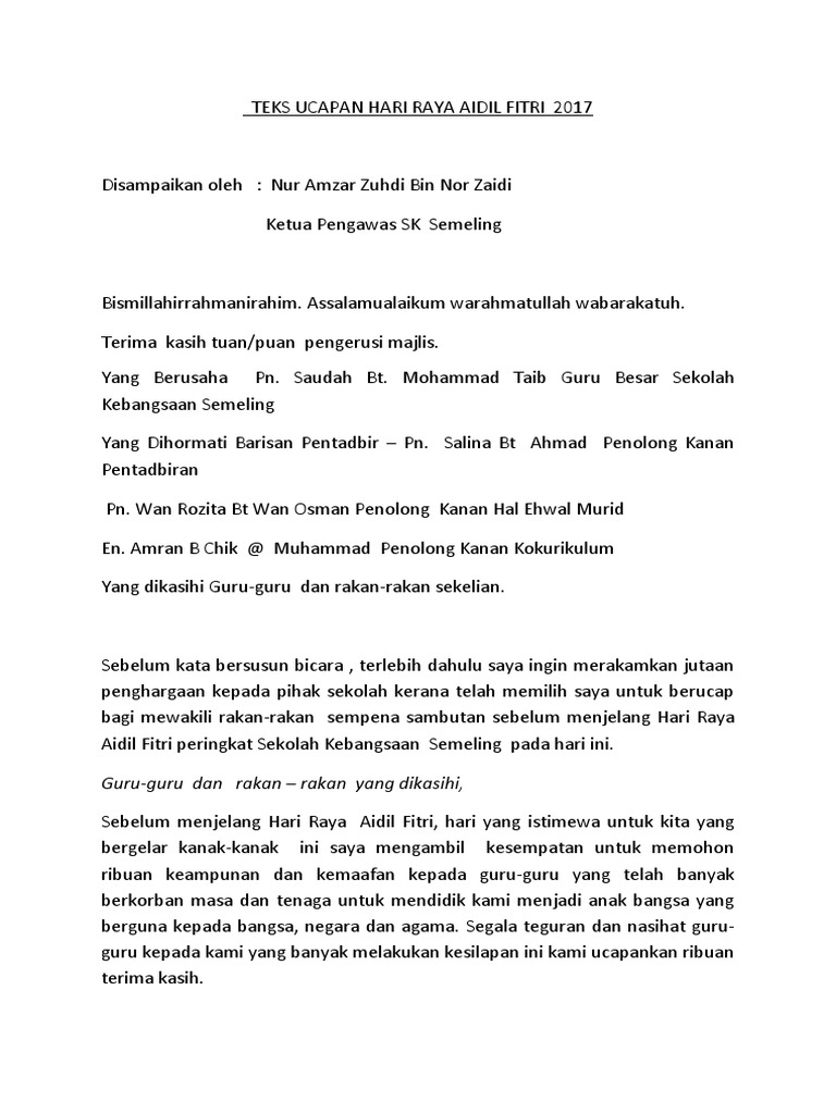 Teks Ucapan Hari Raya Wakil Murid